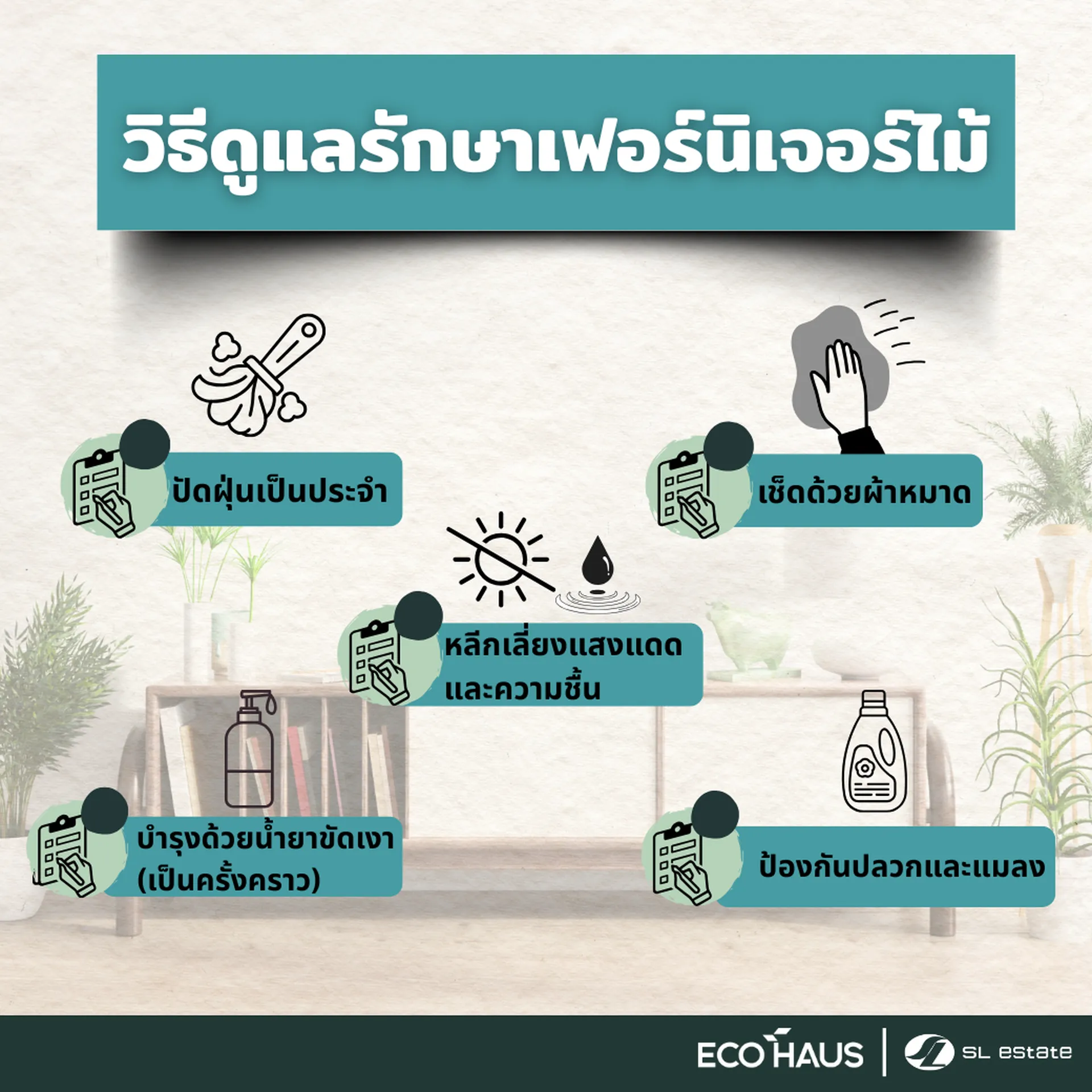 • ป้องกันปลวกและแมลง: หมั่นตรวจสอบเฟอร์นิเจอร์ไม้เพื่อหาสัญญาณของปลวกหรือแมลงกินไม้ และใช้ผลิตภัณฑ์ป้องกันเนื้อไม้ที่เหมาะสม