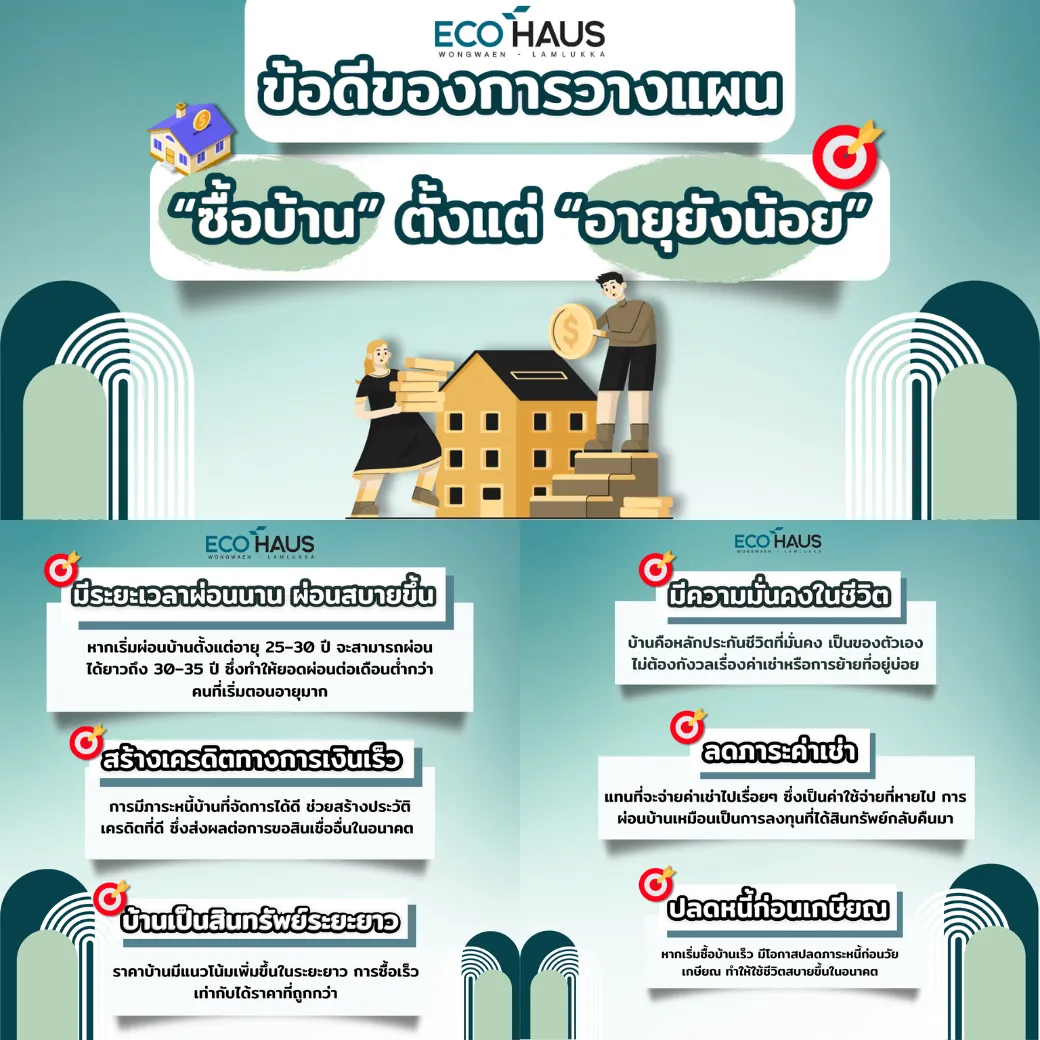 หากเริ่มผ่อนบ้านตั้งแต่อายุ 25–30 ปี จะสามารถผ่อนได้ยาวถึง 30–35 ปี ซึ่งทำให้ยอดผ่อนต่อเดือนต่ำกว่าคนที่เริ่มตอนอายุมาก